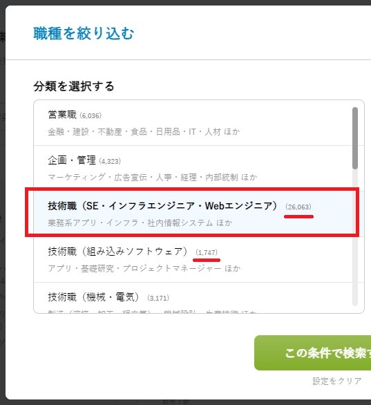 プログラミングに関する職種で絞り込みをしていき、件数の多さによって大まかに需要を把握します。